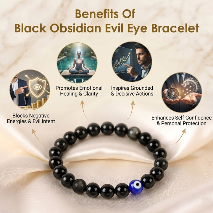 Black Obsidian is known as a powerful protection stone that absorbs negative energy and emotional stress, while the Evil Eye symbol is believed to guard against jealousy and harmful intentions. Together, they create a strong protective energy field that promotes safety, balance, and inner strength.