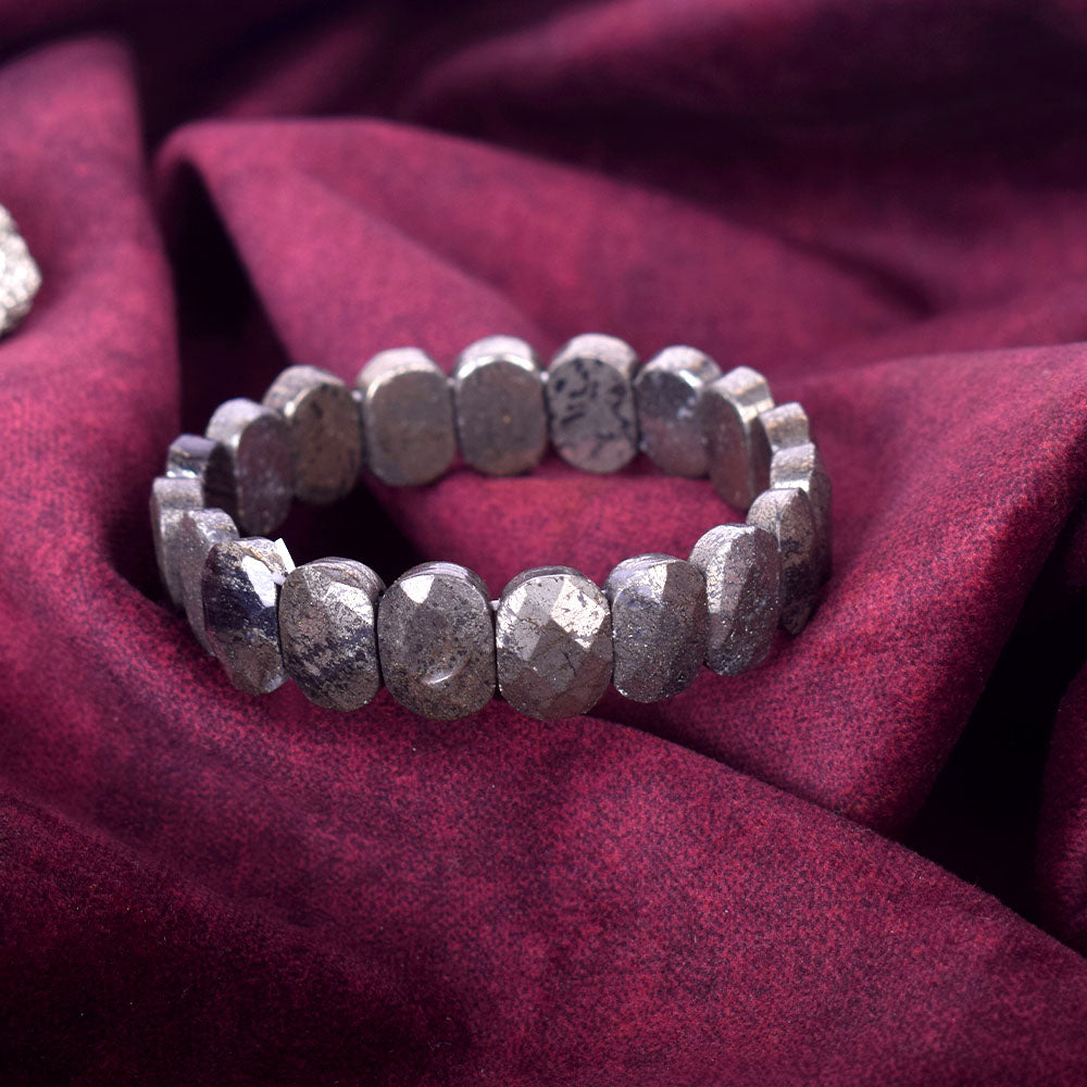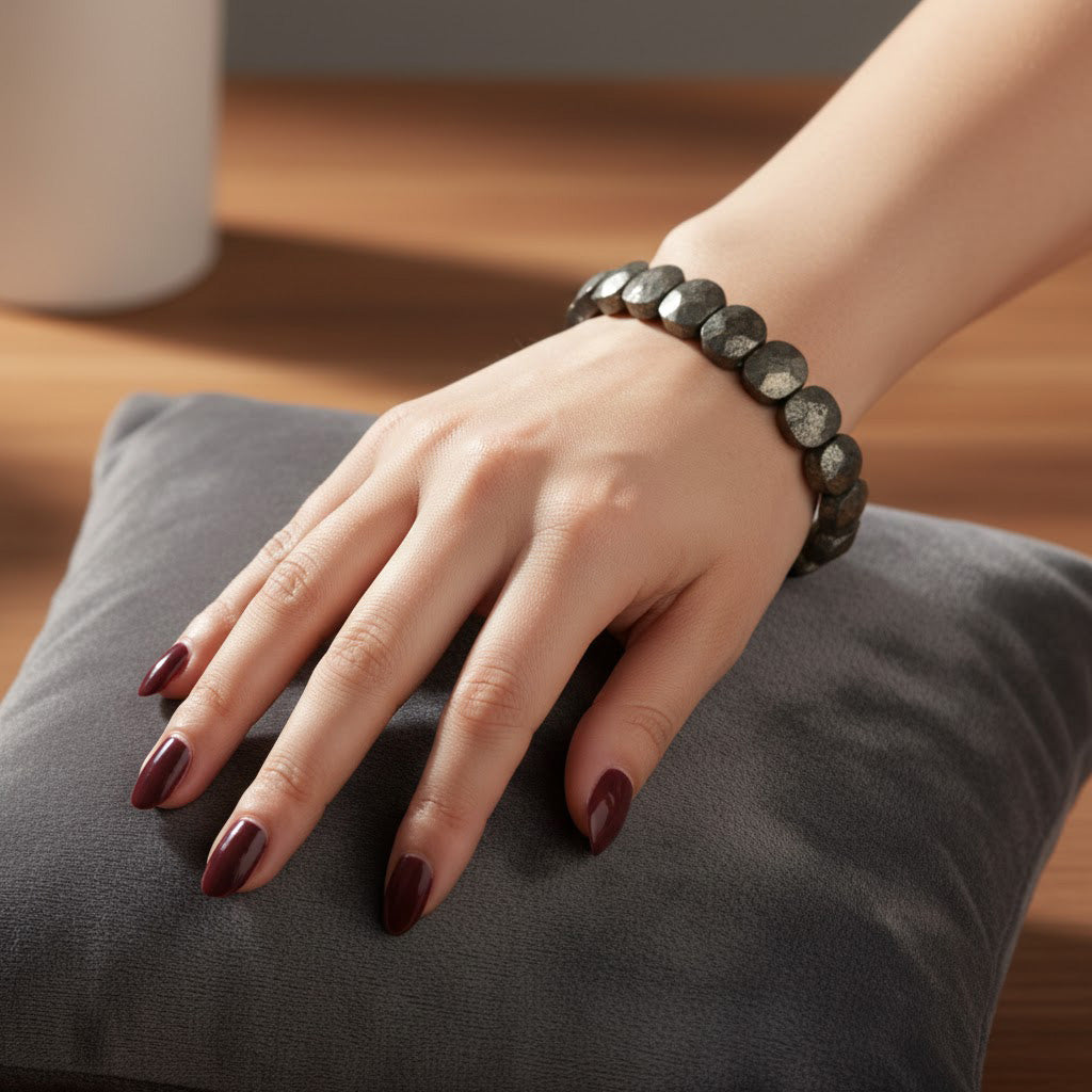 About the Product: The Flat Beaded Pyrite Stone Bracelet is crafted from natural pyrite, a powerful healing stone traditionally associated with wealth, abundance, and protection. The flat bead design gives this bracelet a modern, elegant appearance while maintaining its strong energetic properties.
