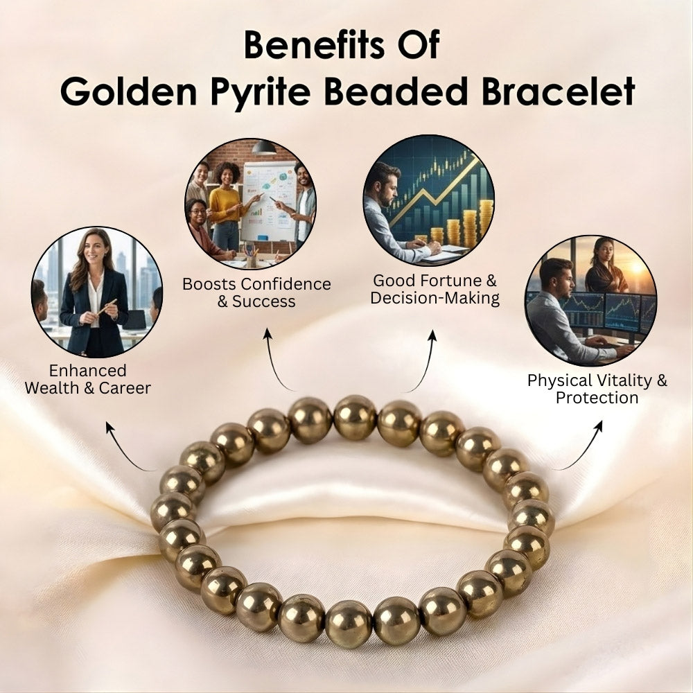About the Product: The Golden Pyrite Beaded Bracelet is crafted from natural pyrite stones, often known as the “Stone of Wealth and Abundance.” This powerful healing stone is traditionally believed to attract prosperity, confidence, and positive energy while protecting the wearer from negativity.