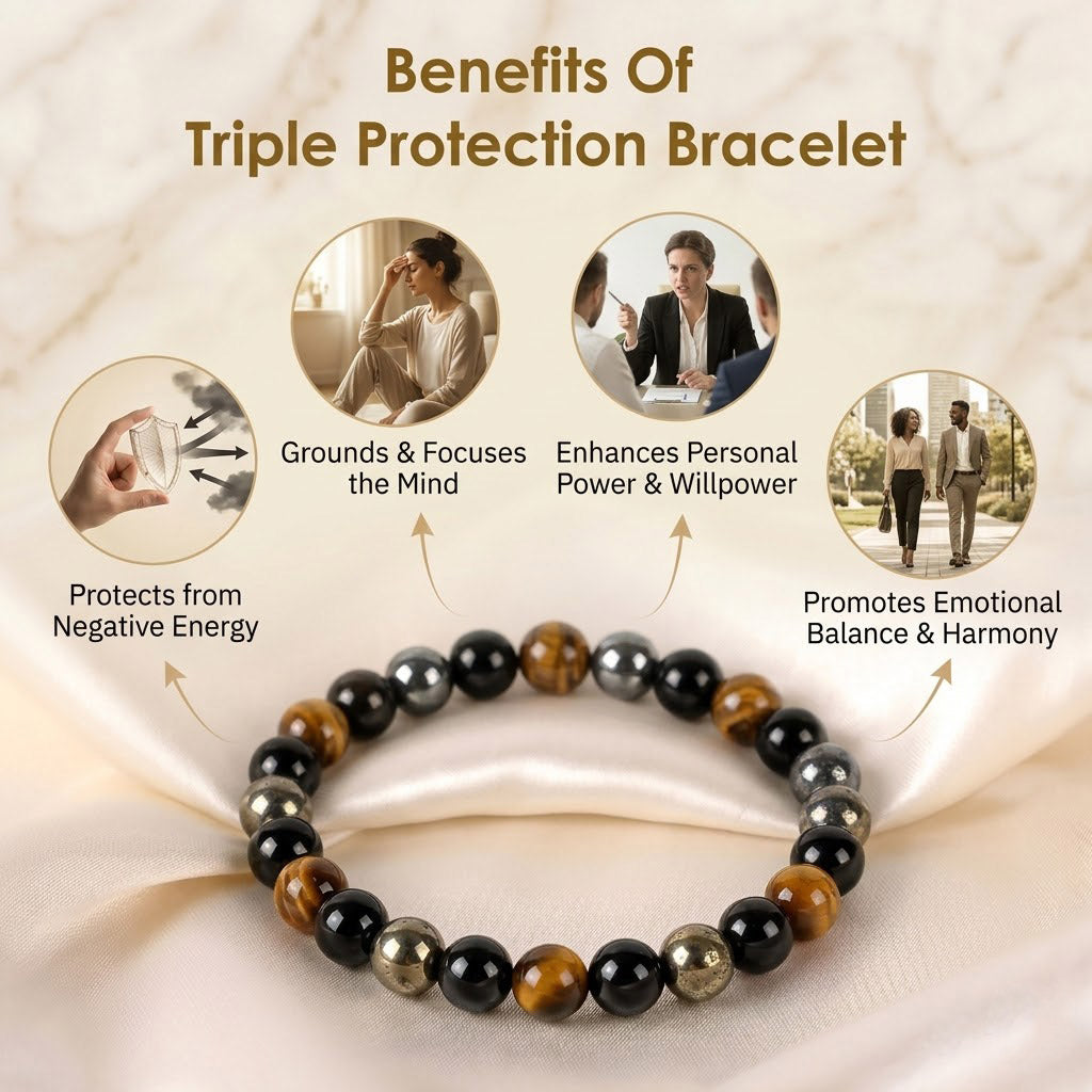 About the Product: The Triple Protection Bracelet is a powerful healing stone accessory designed to provide strong energetic protection, grounding, and emotional stability. This bracelet is crafted using a protective combination of Black Tourmaline, Tiger’s Eye, and Hematite, each stone carefully selected for its ability to shield against negativity and strengthen inner balance.