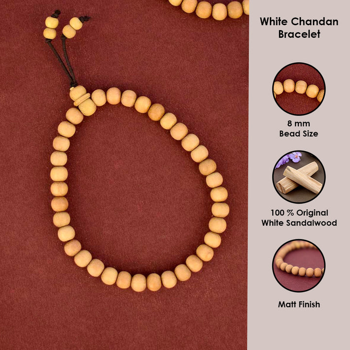 About Product: This White Chandan Bracelet is made from premium natural sandalwood beads, each measuring 8mm in size. It is delicately crafted to offer not just aesthetic elegance but also spiritual serenity and focus.