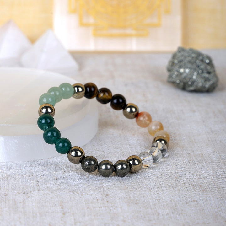 Energy Amplification – The Dhanyog Bracelet with Tiger Eye, Pyrite, Citrine, and Green Aventurine enhances the wealth-attracting energy of the 7 Horses Pyrite Frame.
