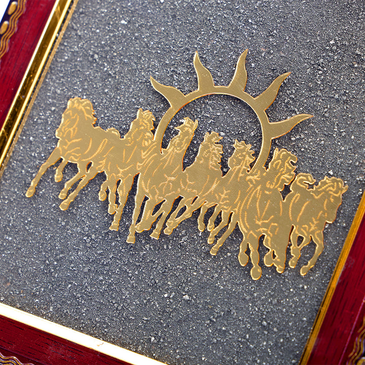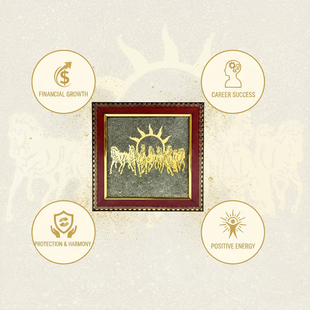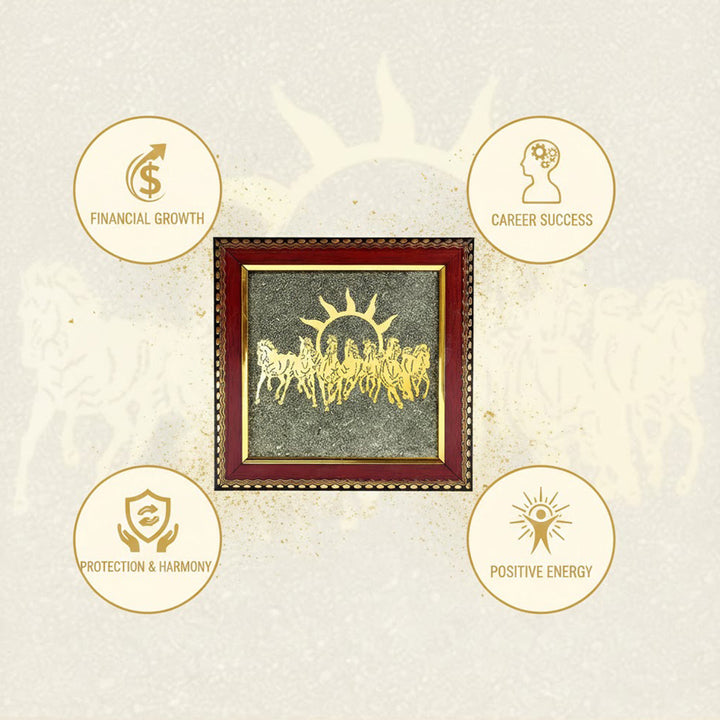 About the Product The 7 Horse Frame with Pyrite Triple Protection Bracelet Combo is a vastu-inspired decorative set with seven running horses and a Pyrite-infused triple protection bracelet. Designed to enhance success, positivity, and balanced energy, this combo is perfect for home, office, and workspace décor.