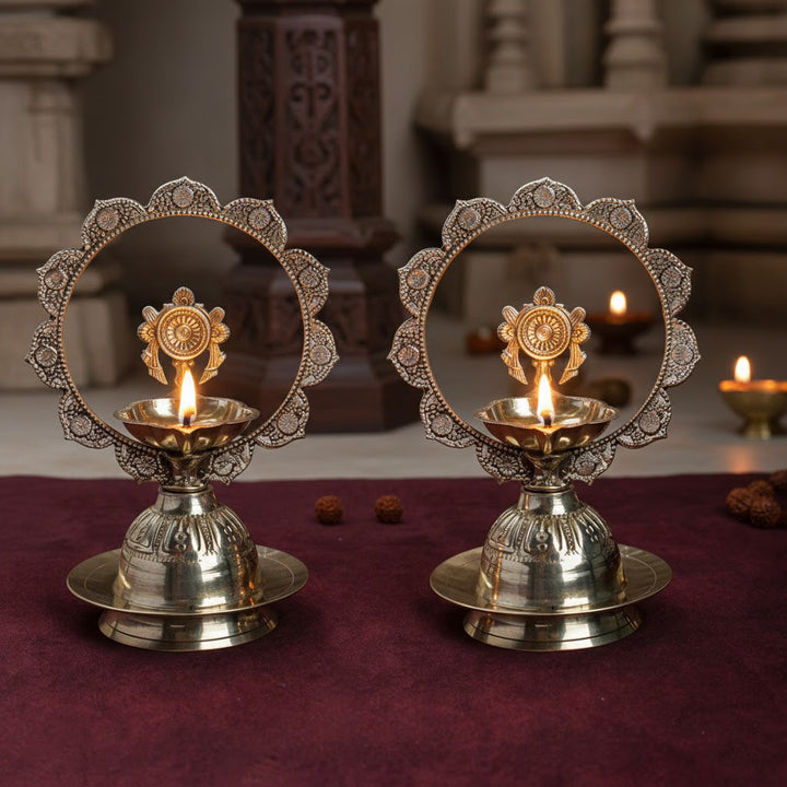 Brass Mor Kiran Diya | Brass Chakra Diya | Brass Shankh Diya | Brass Diya Pair | Traditional Brass Oil Lamp | Spiritual Brass Diya | Pooja Diya Set | Temple Brass Diya | Inauguration Diya | Brass Deepam | Indian Ritual Lamp | Vishnu Shankh Diya | Chakra Lamp Brass | Antique Brass Decor | Diwali Pooja Diya | Home Temple Decor | Traditional Oil Lamp | Kerala Style Brass Diya |Β