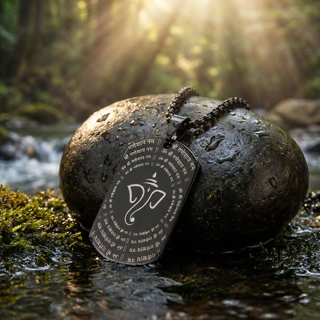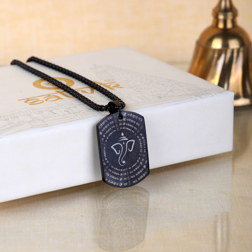 About Product: The Ganpati Shlok MicroCarved Black Pendant is a spiritually powerful accessory that features a finely micro-carved Ganpati shlok, symbolizing wisdom, prosperity, and the removal of obstacles. Crafted with precision detailing on a refined black finish, this pendant reflects devotion combined with elegant craftsmanship.