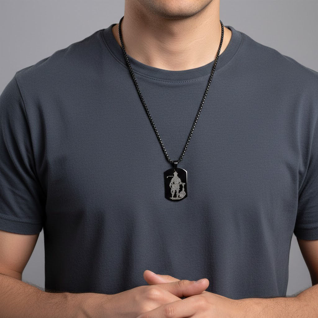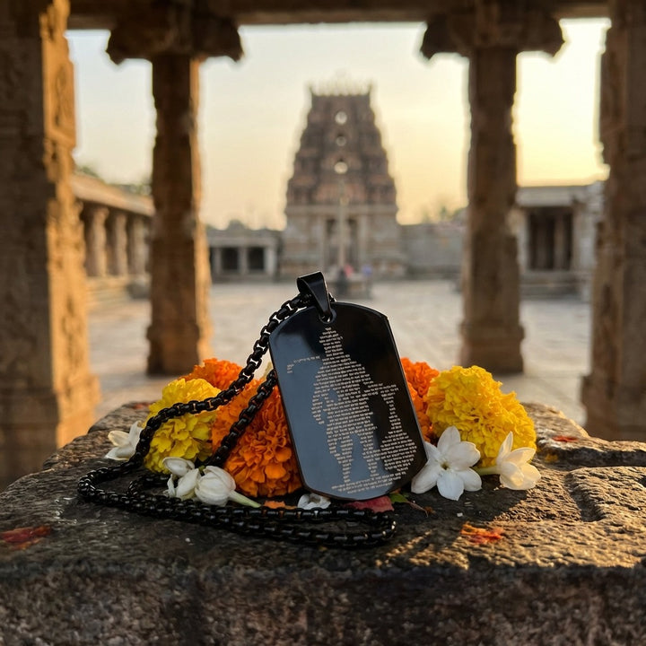 About Product: The Lord Hanuman Engraved with Hanuman Chalisa Black Pendant is a powerful symbol of devotion, strength, and unwavering faith. This pendant features a finely engraved image of Lord Hanuman, along with sacred verses from the Hanuman Chalisa, intricately detailed on a sleek black-finish surface.
