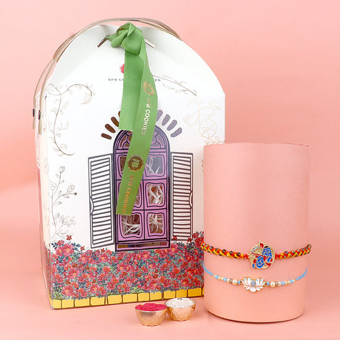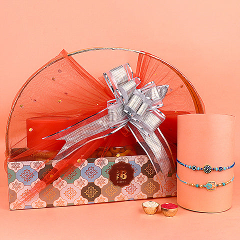 Our Bhaiya Rakhi with Gift Hamper is a delightful combination that includes a beautifully handcrafted Rakhi, lovingly designed to symbolize the bond between siblings, along with an assorted gift hamper packed with goodies and tokens of affection. This exclusive Rakhi hamper is a perfect way to shower your brother with love and blessings on this auspicious day.