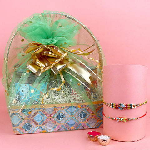 Accompanying the Rakhi is a thoughtfully curated gift hamper, designed to delight your dear Bhaiya with a selection of his favorite treats, chocolates, or thoughtful keepsakes. The hamper is carefully packed, ensuring that every element is of the finest quality and chosen with love, making it a truly heartwarming gift.