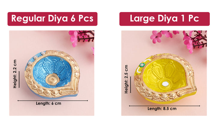 • Product Details: Material: Clay/Terracotta Dimensions: Regular Diya Height: 2.2cm, Length: 6cm, Large Diya Height: 2.5cm, Length: 8.5cm Weight: 700gram, Finish Type: Glossy.