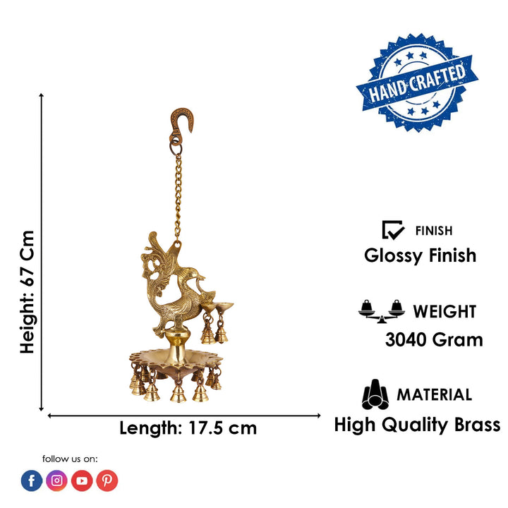 • About Product: Satvik Store Presents Brass Peacock Diya Hanging with Bells. Any festive occasion will be made wonderfully auspicious by the grace and beauty of the Peacock Brass Handcrafted Hanging Diya. Given that it was made by hand, the piece's abnormalities and flaws only serve to enhance Diya's allure and charisma. Brass, an auspicious and sacred metal that is traditionally used in all Hindu prayers, is utilized to manufacture the Diya. We give a really precious enhancement to your favorite temple that you and your loved ones will adore. Our Antique Brass Peacock Diya strikes the ideal balance between elegance and beauty, grace and functionality, and modern and traditional design elements.