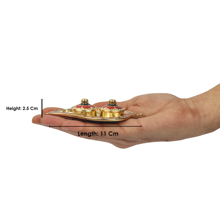 About Product: Satvik Store Presents Beautiful Roli Akshat Leaf Platter. This small and adorable platter comes adorned with meenakari work and two small bowls attached for roli and akshat on leaf.