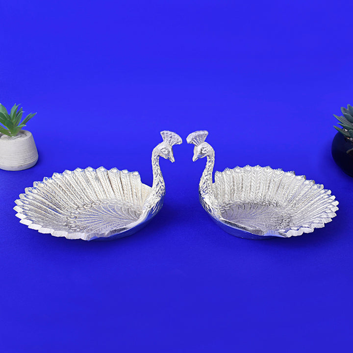 Silver Peacock tray | Silver plated Peacock tray | Metal Peacock tray for pooja | Silver decorative tray | Silver Peacock serving tray | Silver tray for dry fruits | Silver Peacock pooja accessory | Silver Peacock design platter | Silver Peacock tray for gifting | Traditional silver Peacock tray