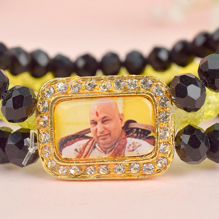 black neon yellow guruji bracelet | triple layer bracelet | black beads bracelet | neon yellow beads bracelet | bold guruji swaroop bracelet | stylish daily wear bracelet | guruji bracelet for men and women | spiritual bracelet india | jai guruji bracelet | handmade spiritual jewellery | pooja return gift | satvikstore bracelet | vibrant spiritual jewellery | multi layer guruji bracelet | electric spiritual accessory | graceful guruji bracelet | india spiritual brand