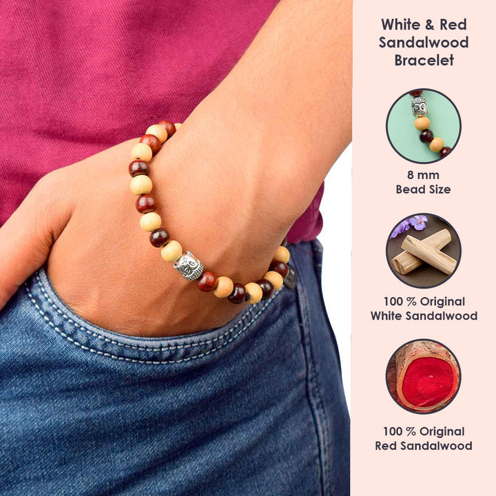 About Product The Buddha Red and White Sandal Bracelet is a divine blend of spiritual elements, designed to bring peace, clarity, and energy balance to the wearer. Made using authentic red and White Sandalwood beads, this bracelet symbolizes purity and strength. It is inspired by Buddhist traditions and worn to enhance spiritual awareness while offering calming benefits. Its dual-tone design is not only aesthetically appealing but also rich in energy and symbolism. A perfect accessory for meditation, spiritual gatherings, or daily wear.