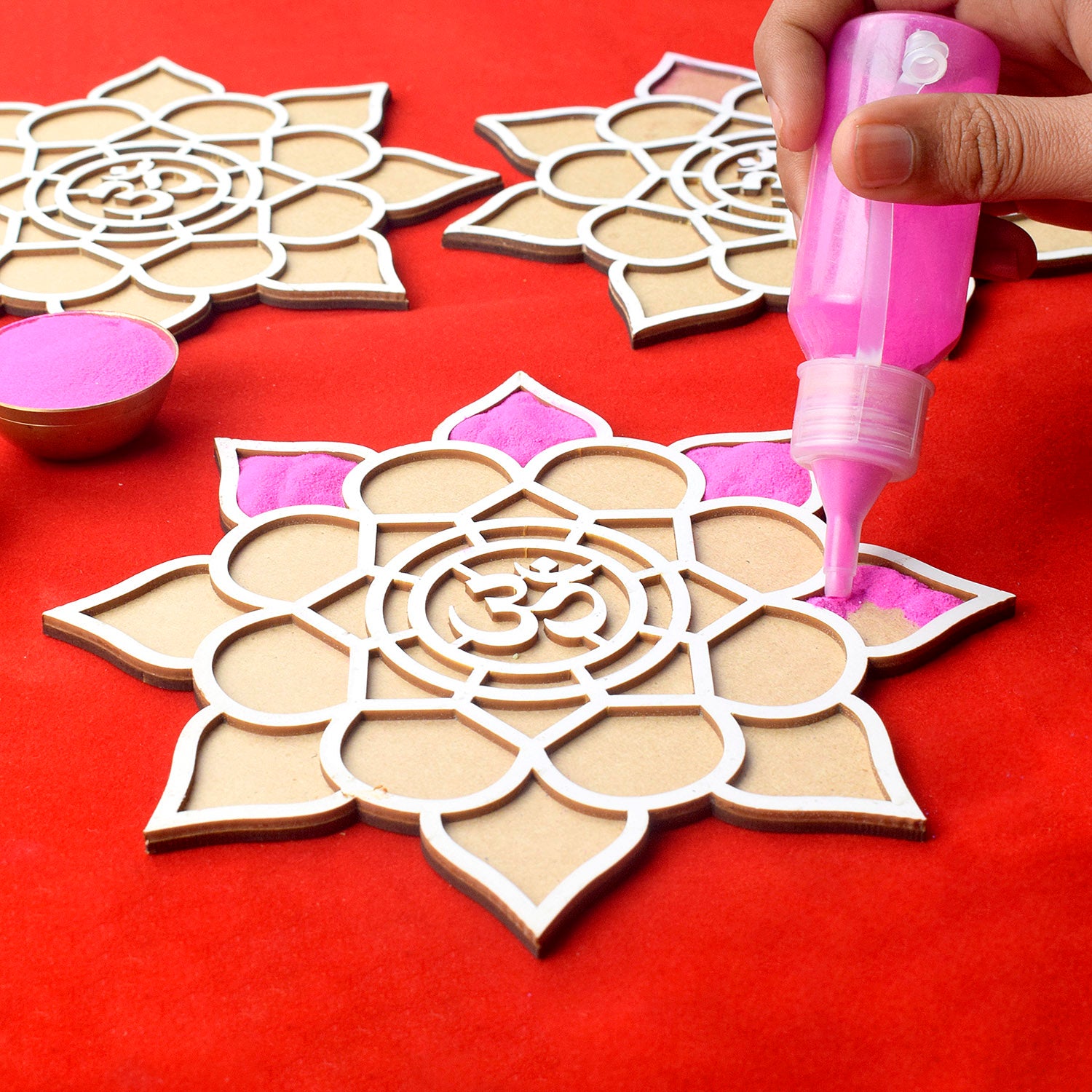 • Material & Size: Portable Rangoli crafted from MDF material not flexible like any other so that you can easily move even filled rangoli here and there. They are available in four exquisite designs, each measuring 8 inches.