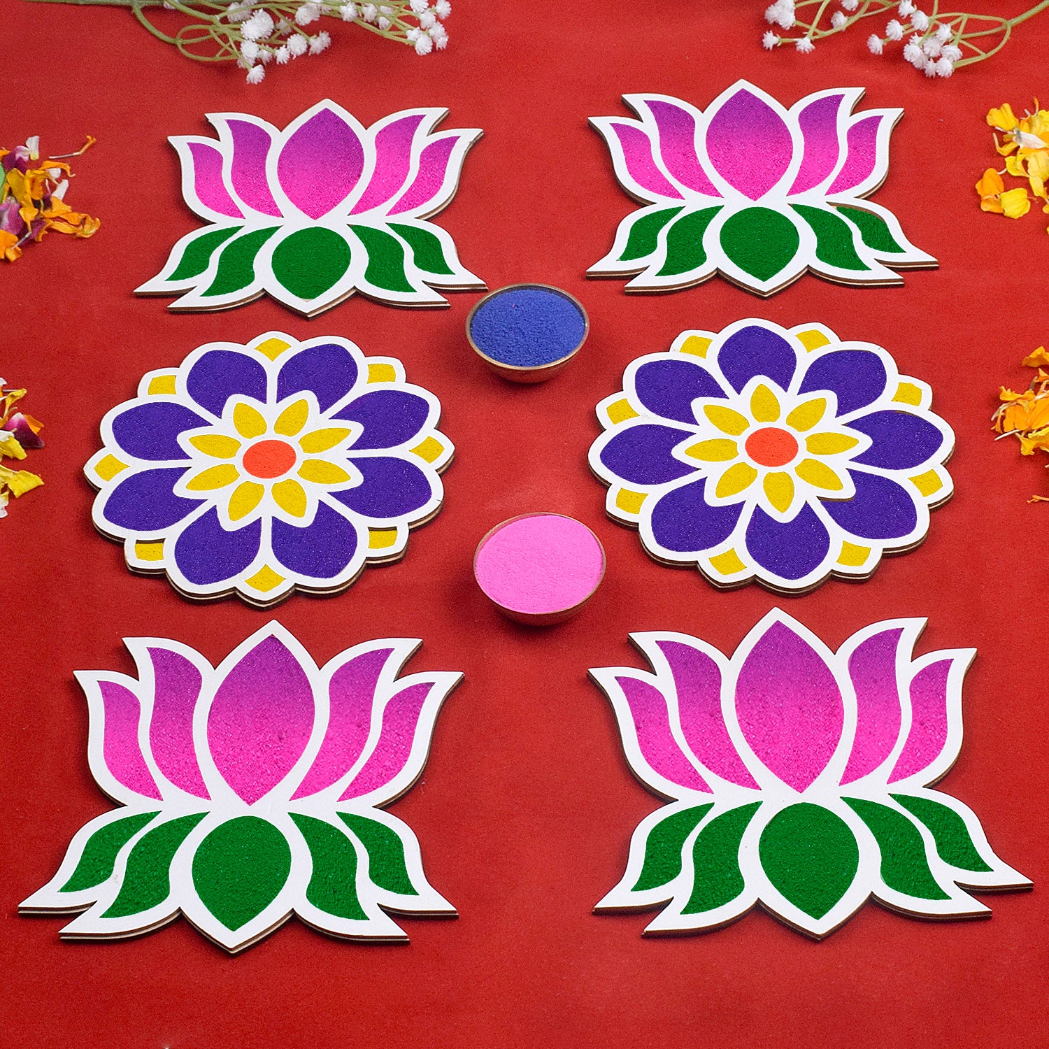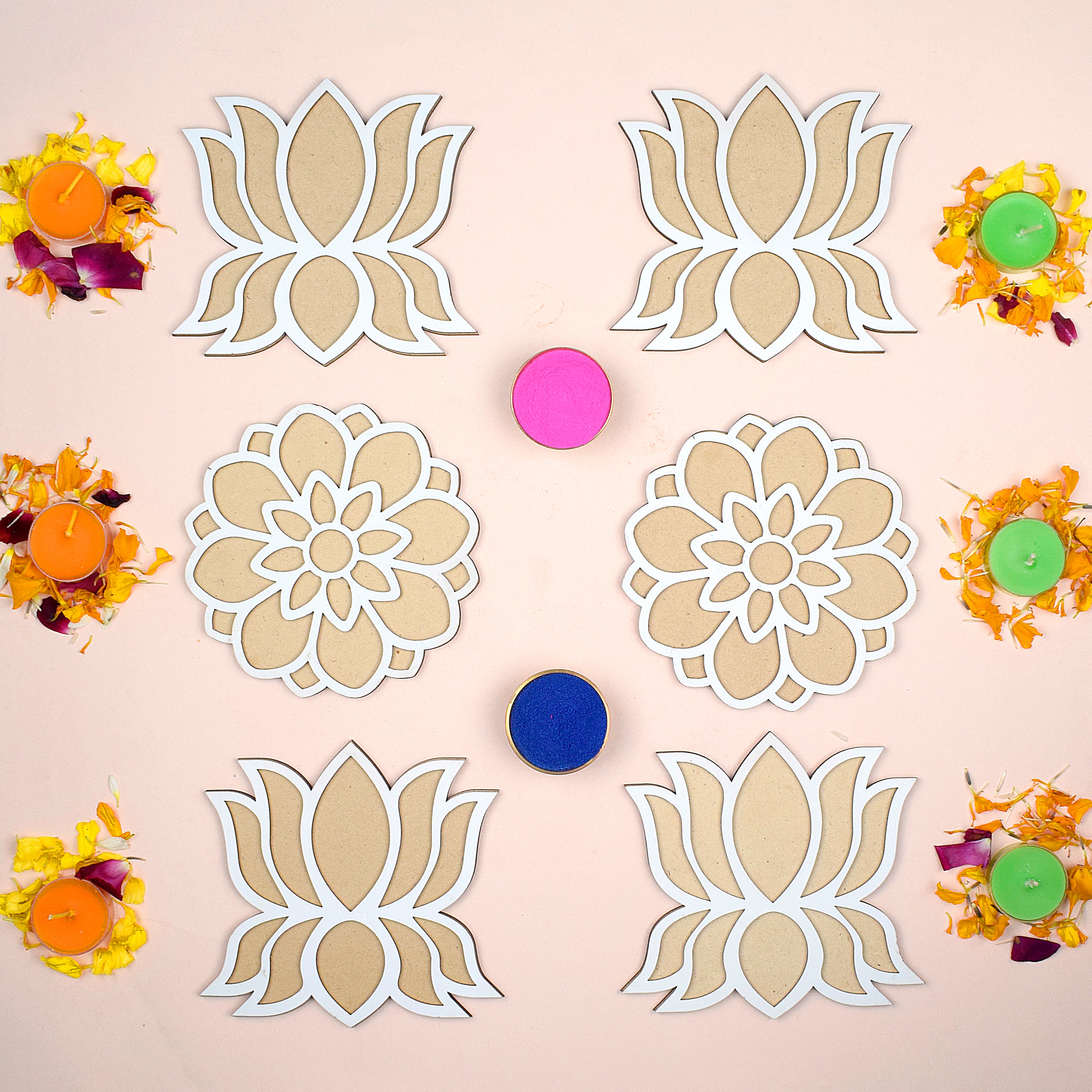 • Material & Size: Portable Rangoli crafted from MDF material not flexible like any other so that you can easily move even filled rangoli here and there. They are available in four exquisite designs, each measuring 6 inches.