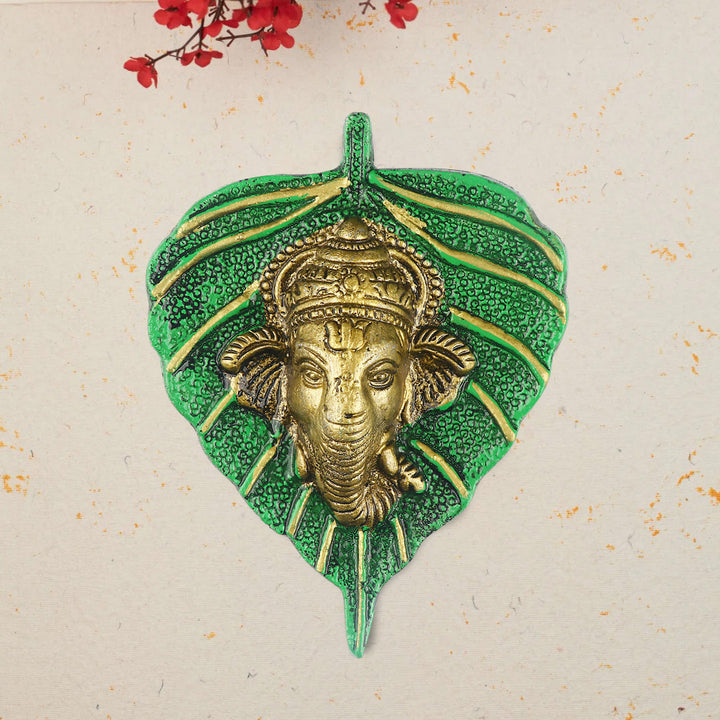 Ganesh wall hanging | Ganesh face on leaf | Leaf patta Ganesh decor | Lord Ganesha wall art | Spiritual wall hanging | Decorative Ganesh idol | Hindu god wall decor | Ganesh face decor | Traditional wall hanging |