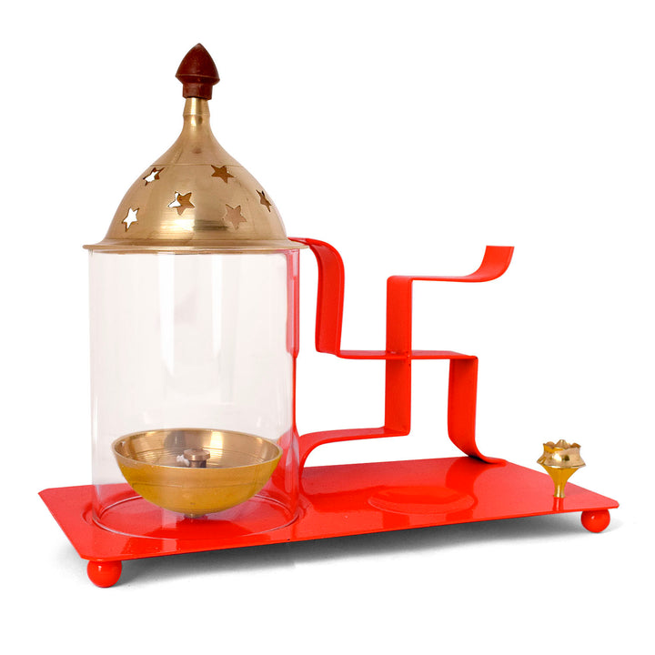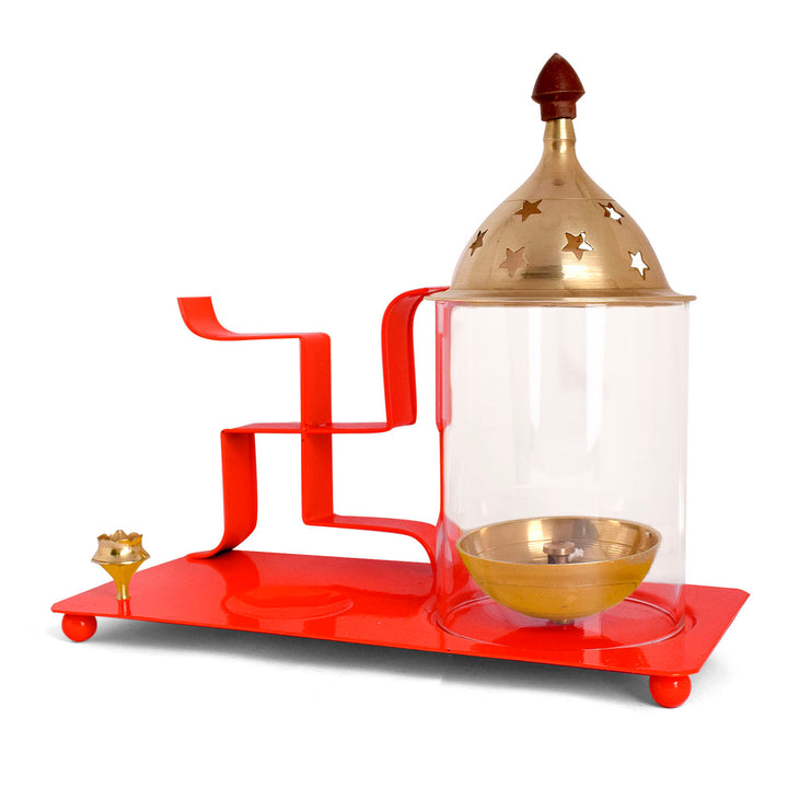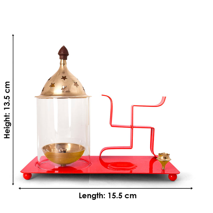 Brass & Metal Swastik Chimney Diya Tray with Incence Holder Small (Red)