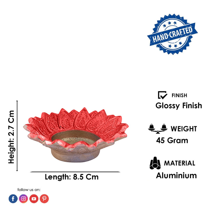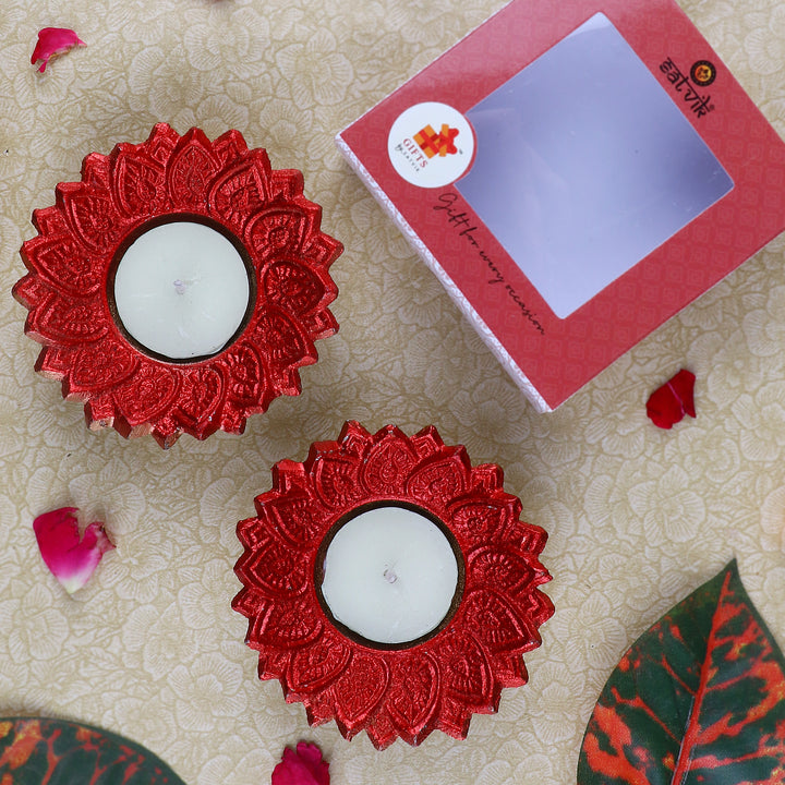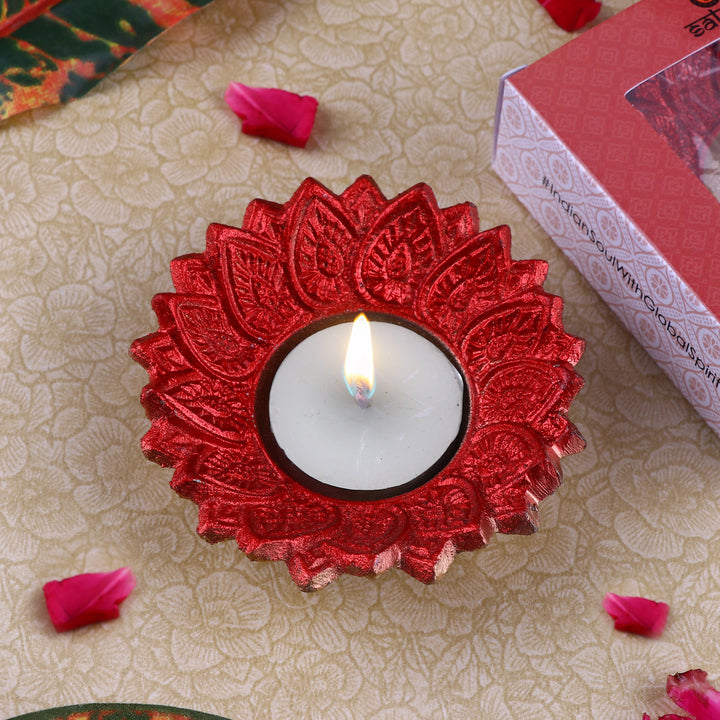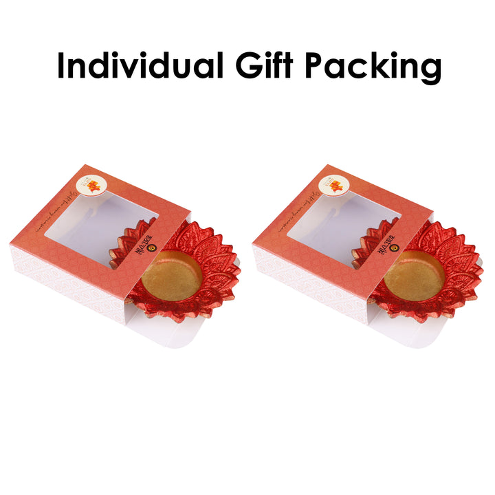 • Item Name: Set of 2 Pc Designer Red Floral Shape Metal Diya and 2 Pcs of Candle Tea Lights. Each Comes with Premium Gift Packing.
