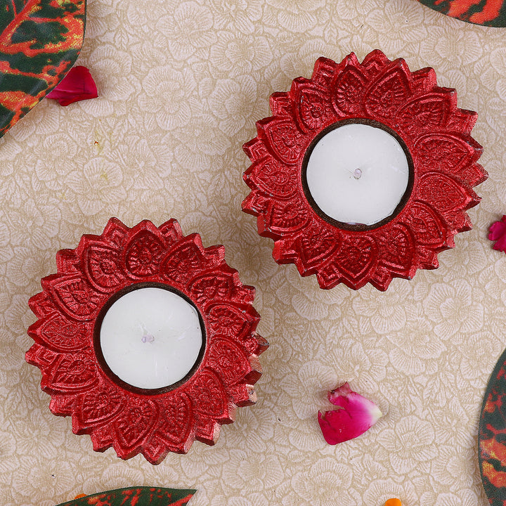 Floral Chakra Metal Diya in Red Color (Pack of 2)