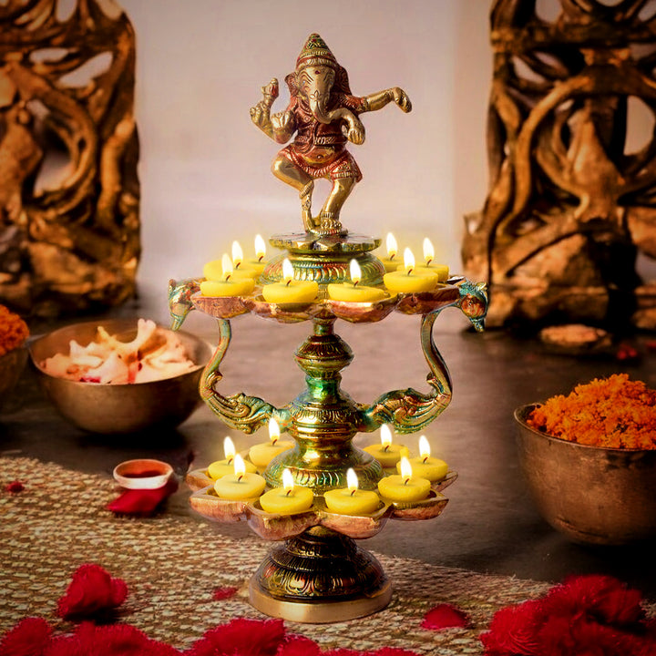 Handcrafted Brass 21 Wick Ganesha Diya – 2 Step Aarti Lamp