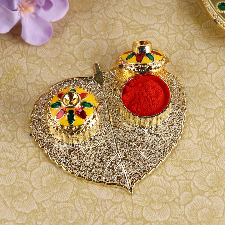 About Product: Satvik Store Presents Beautiful Roli Akshat Small Pan Leaf Platter. This small and adorable platter comes adorned with meenakari work and two small bowls attached for roli and akshat on leaf.