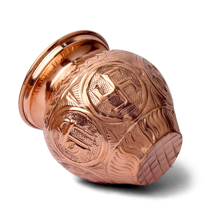 Copper Om Swastik Lota | Copper lota for pooja | Om Swastik design lota | Copper water pot for rituals | Spiritual copper lota | Holy water copper lota | Copper lota with sacred symbols | Pooja copper lota | Om Swastik pooja accessory | Pure copper lota | Copper kalash for worship | Copper lota for temple use |