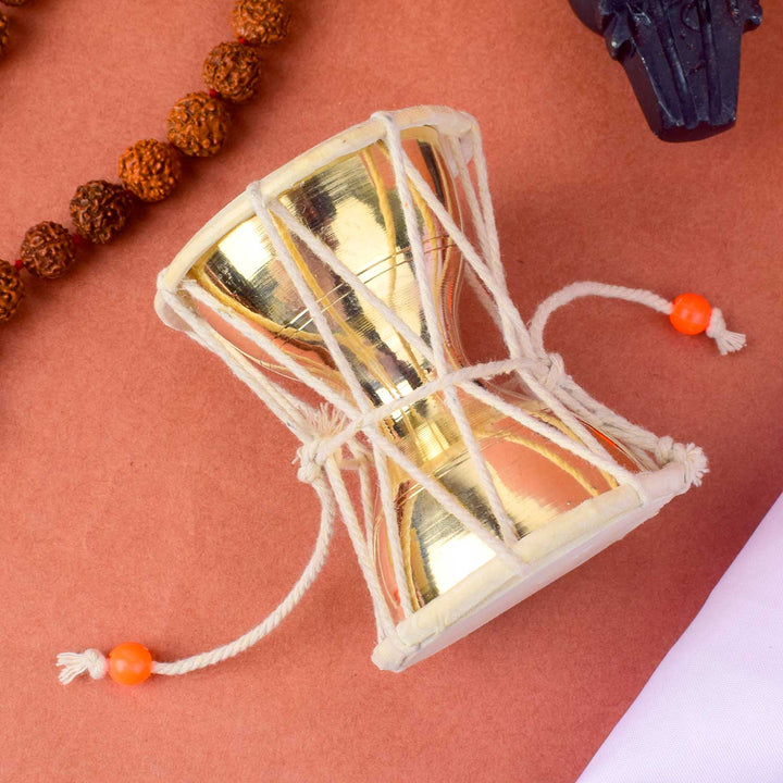 divine brass damru | brass damru for pooja | 4 inch pooja damru | compact damru for temple | damru for lord shiva | spiritual damru instrument | meditation damru | brass damaru | shiva damru for aarti | pooja accessories india
