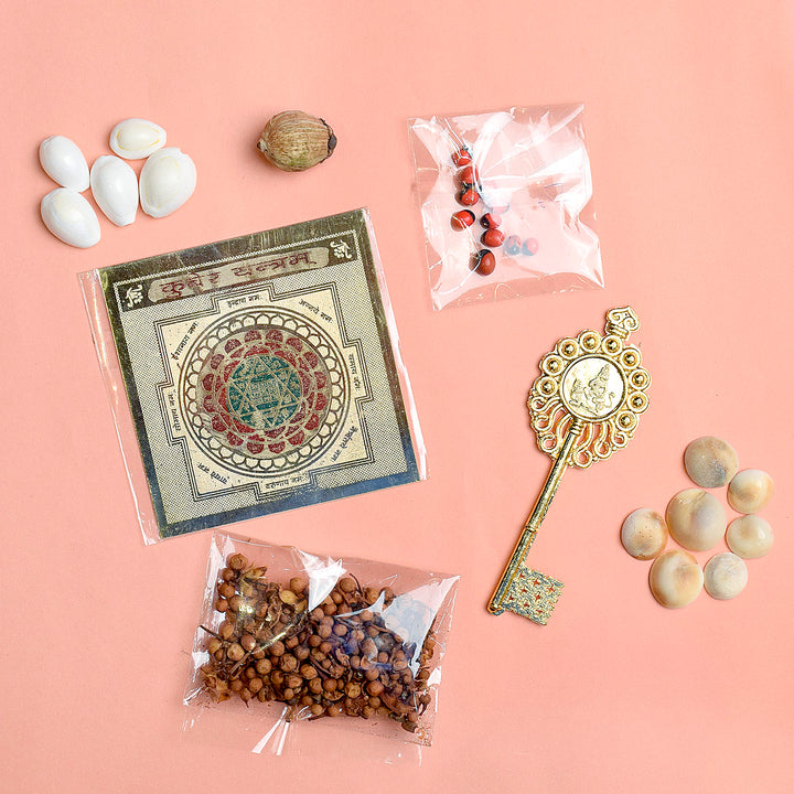 • Siddha Kuber Yantra, Kuber Kunjika, Lal Rati, Kodi, Gomti Chakra, Nag Champa, and Laghu Shrifal are among the items found in Kuber Potli.