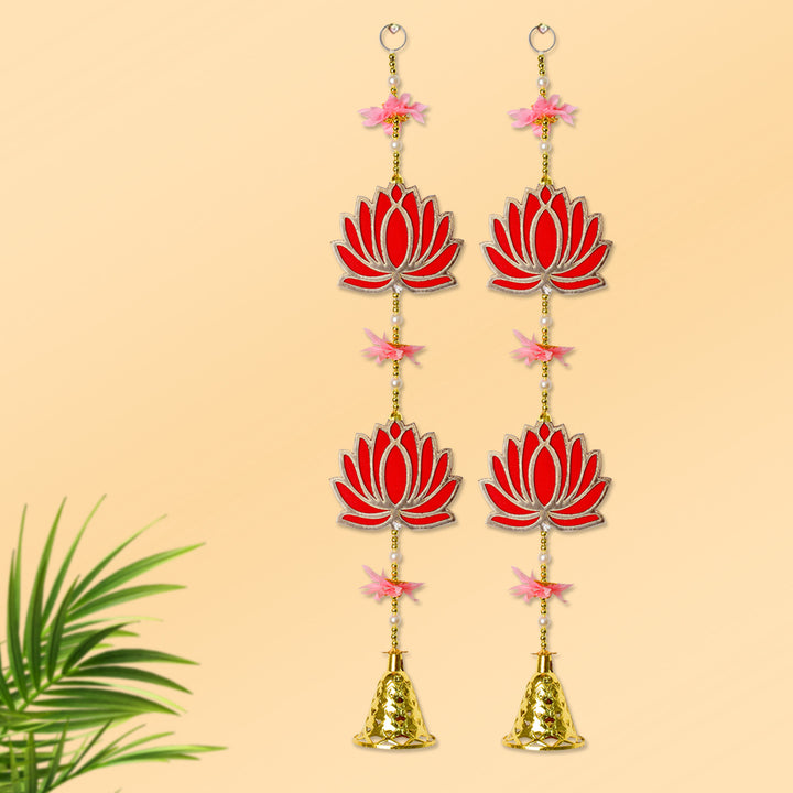 Decorate your home with a festive and spiritual vibe using this 2 Tier Lotus with Bells Wall Hanging Backdrop (1 Pair Latkans). Made with elegant acrylic sheet lotus designs, shiny golden bells, and beautiful beads, this hanging brings a rich, layered look to your walls or door frames.