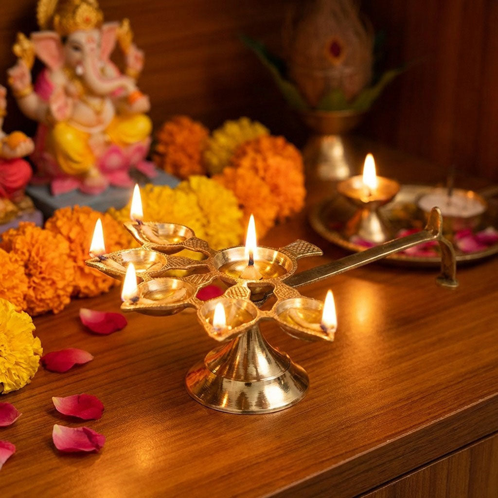 About Product:Β  Bring home the sacred tradition with this Brass 5 Mukhi Aarti Diya, beautifully engraved to enhance your pooja rituals. With five wicks, it is perfect for use with cotton wicks and oil or ghee during aarti. Lighting this diya invites positivity, peace, and spiritual energy into your home.Β Handcrafted from premium brass, this 5 Mukhi Aarti Diya is ideal for daily worship, Diwali celebrations, and festive rituals, and makes a meaningful gift for family or loved ones seeking spiritual harmony.