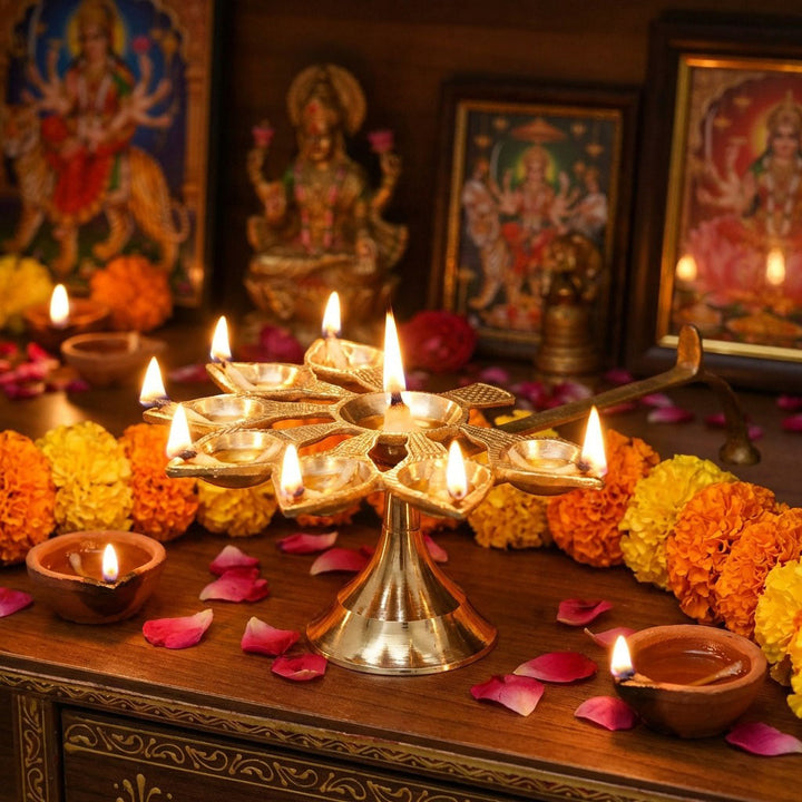 About Product: This exquisitely engraved Brass 7 Mukhi Aarti Diya reflects timeless tradition and spiritual elegance. Designed with seven wicks, it is used with oil or ghee and cotton wicks during sacred rituals and aarti. Lighting the diya symbolizes positivity, purity, and the start of auspicious occasions. Meticulously handcrafted from high-quality brass, this 7 Mukhi Aarti Diya adds a refined touch to home temples and sacred spaces. Ideal for daily prayers, Diwali celebrations, and festive rituals, it also makes a thoughtful Diwali or spiritual gift for loved ones.