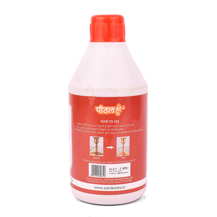 Satvik Liquid Metal Polish is Multipurpose Polish which Comes in Liquid Form. This is helpful in cleaning of Brass ,Copper, Alluminium, Stainless Steel Utensils, Ornaments, Dinnerware, Cups Mugs, Oil Lamps. Its also helpful to Clean Diwali Diya made of brass and copper. Moscow Mule, Copper & Brass Thali Set Etc. Pitam Cleaner Bari Brass Cleaner.