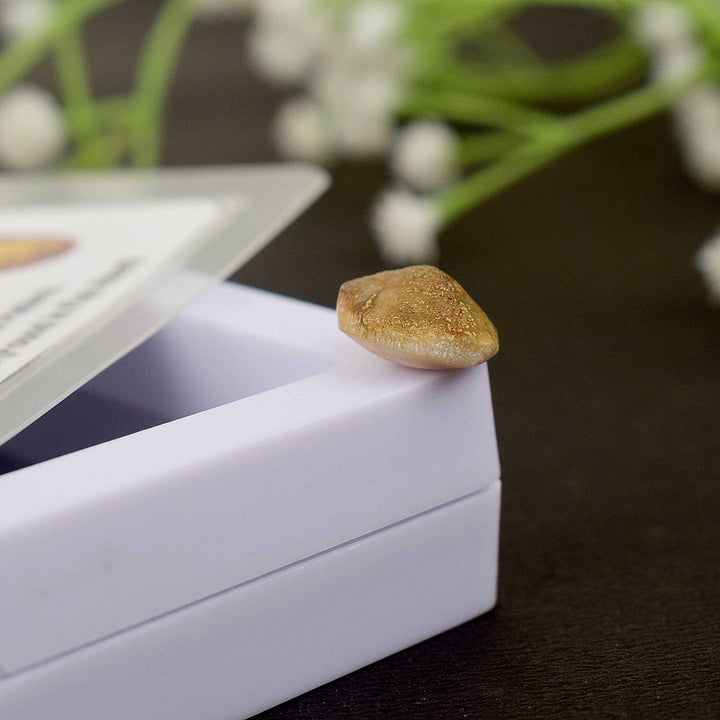 About Product: The Natural Machh Mani, also known as Fish Pearl or Machmani, is a rare and spiritually significant gem revered in Vedic traditions. It is said to originate from inside special species of aquatic creatures and is cherished for its divine properties and astrological benefits. This sacred artifact, coated in a golden finish, is used to channel powerful energy during spiritual practices, rituals, and protective ceremonies.