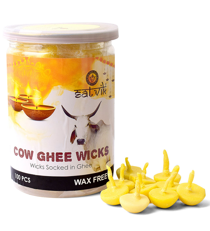 pure cow ghee diya wicks | wax free cow ghee batti | 50 pcs cow ghee diya batti | long lasting cow ghee wicks | eco-friendly cow ghee wicks | handmade cow ghee batti | cotton ghee wicks for pooja | ayurvedic cow ghee wicks | spiritual cow ghee diya | satvikstore cow ghee wicks