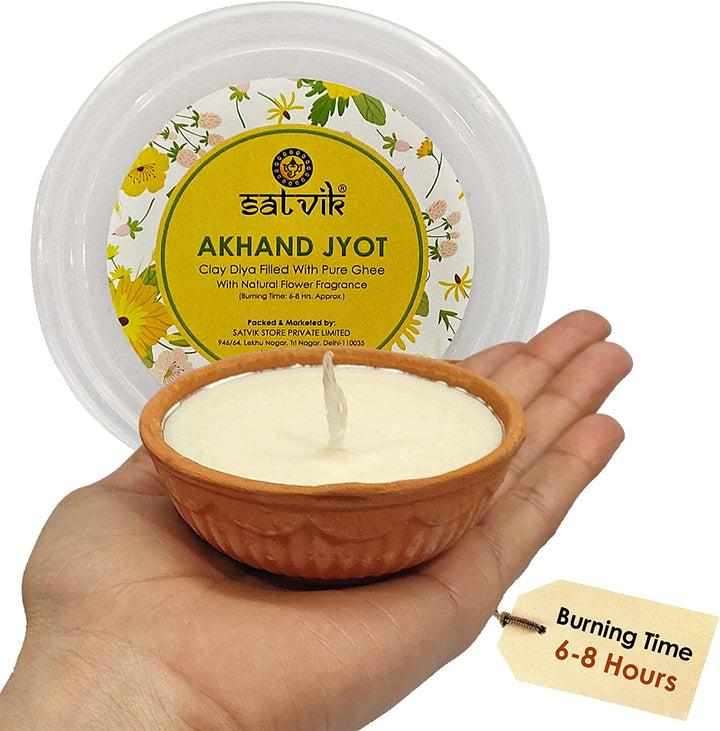 About Product: Satvik Presents Akhand Jyot Clay Diya Pack of 1 Filled with Pure Ghee Wicks Tibetan Buddhist Butter Lamp With Natural Floral Fragrance 6 to 8 Hours Burning Time (Pack of 1)