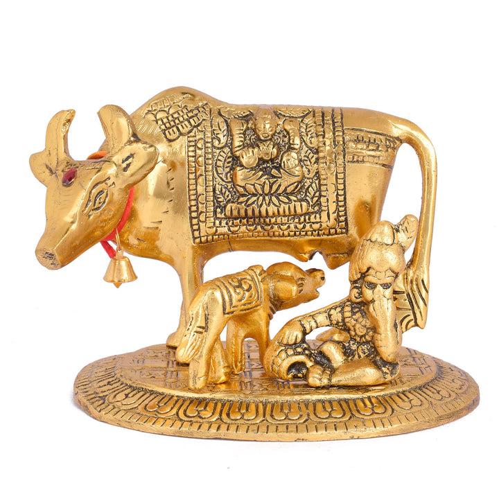 Kamdhenu Cow Idol | Brass Kamdhenu Cow with Laddu Gopal | Puja Room Decor | Brass Idol | Brass Gift Item for Housewarming | Premium Brass Idols for Sale | Brass Kamdhenu Cow with Laddu Gopal and Calf | Antique Kamdhenu Cow with Laddu Gopal |