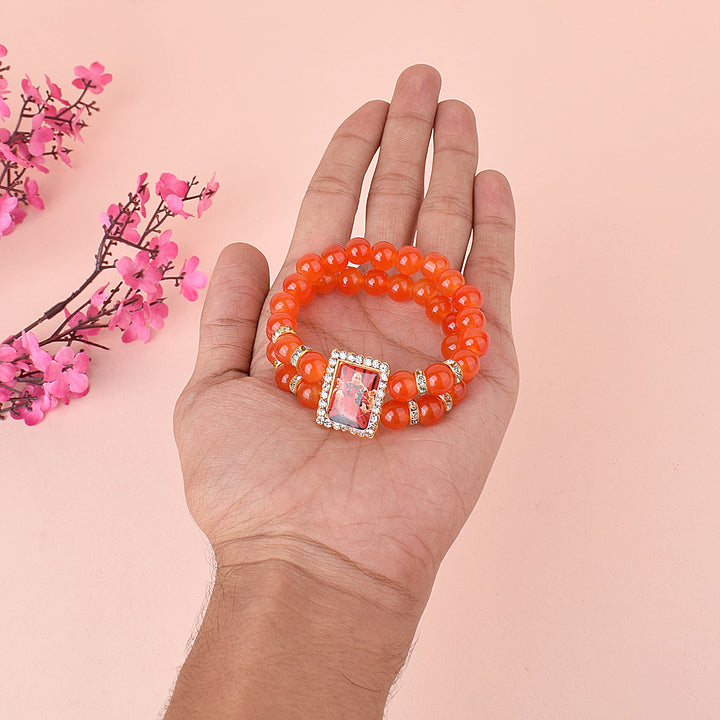 • Item Name: Orange Double Band Round Pearl Bracelet with Jai Guruji Swaroop Handmade Bracelets for Men and Women