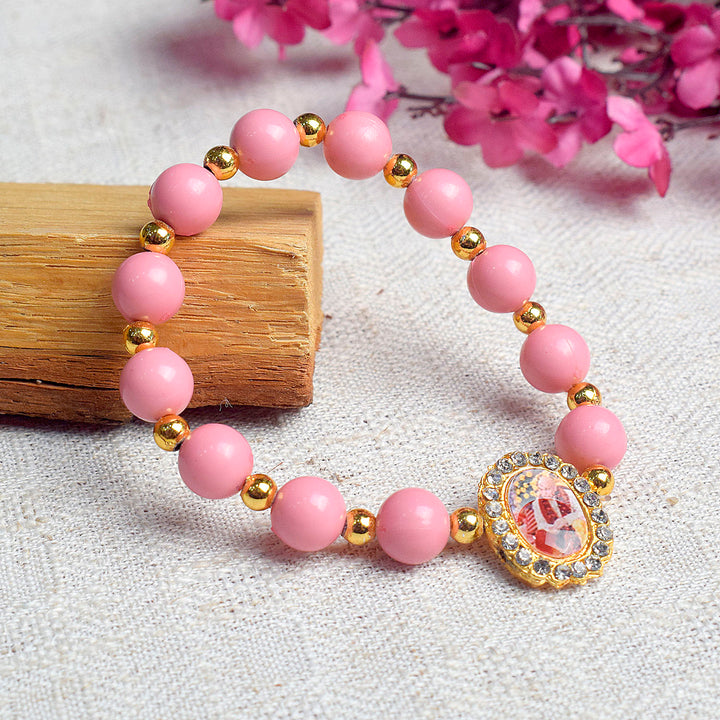 • Item Name: Pink Round Pearl Bracelet with Jai Guruji Swaroop Handmade Bracelets for Men and Women