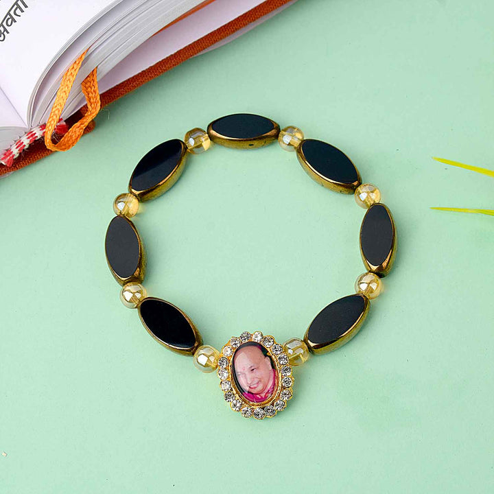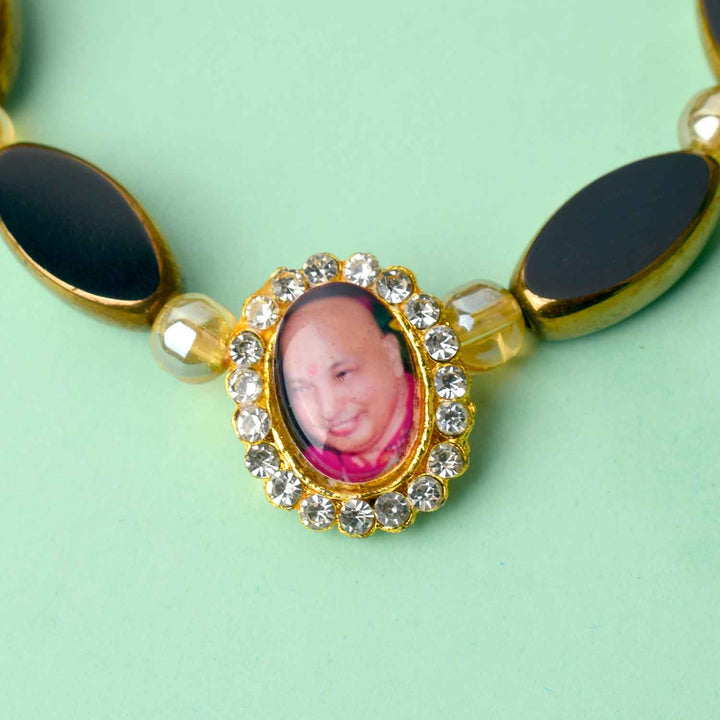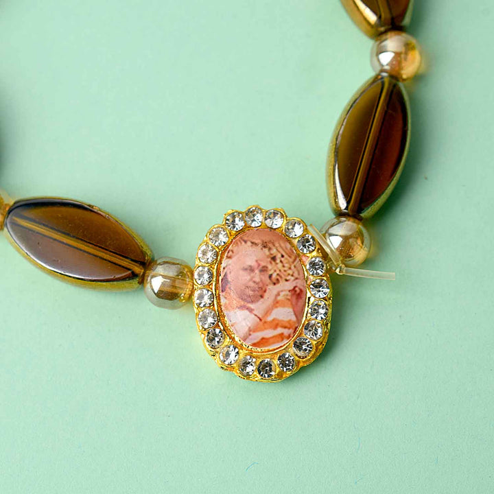 guruji bracelet with translucent beads | oval bead guruji bracelet | guruji swaroop bracelet | spiritual bracelet india | brown black guruji bracelet | spiritual bracelet for men | spiritual bracelet for women | daily wear spiritual bracelet | unisex guruji bracelet | handmade guruji bracelet | pooja return gift bracelet | satvikstore bracelet | devotional accessories india