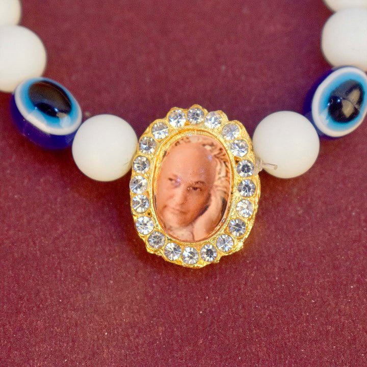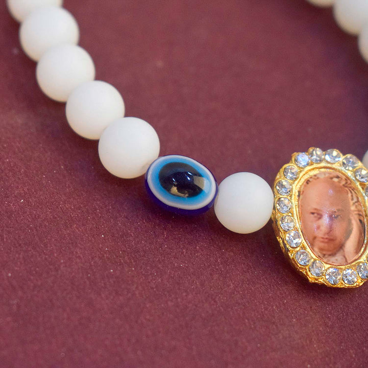 Item Name: White Beads with Evil Eye Single Layer Guruji Swaroop Bracelet
