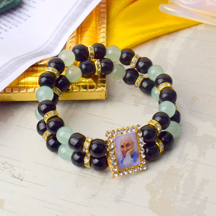 Our Guruji bracelet is a tangible symbol of divine connection. Crafted with care and reverence, it is designed to be worn close to your heart, serving as a constant reminder of Guruji's presence. The bracelet is adorned with sacred symbols and gemstones that hold spiritual significance, channeling positive energy and protection.
