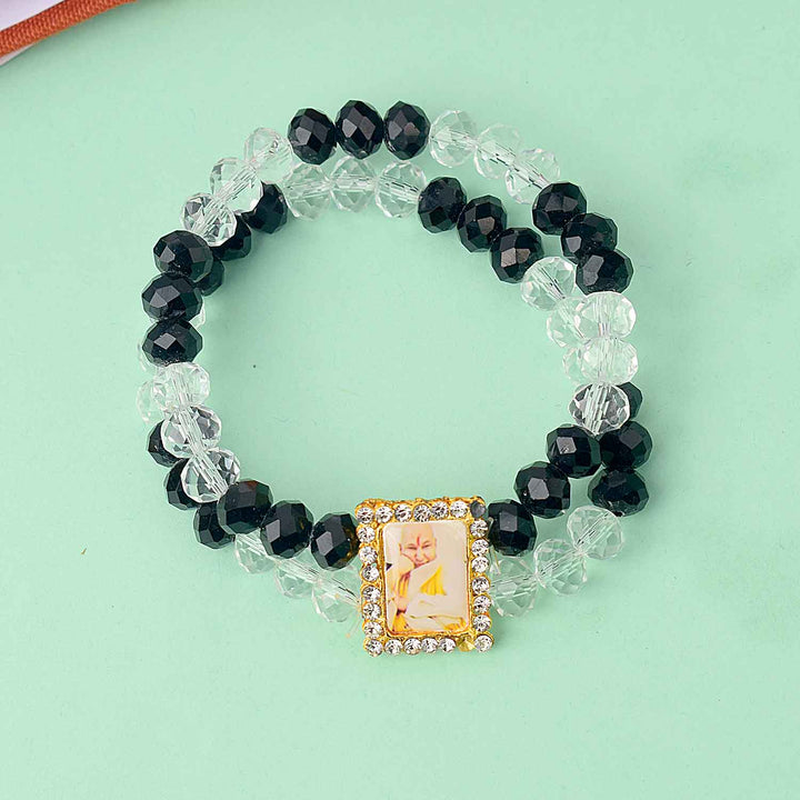 Item Name: Guruji Swaroop Bracelet (Clear & Black Beads)