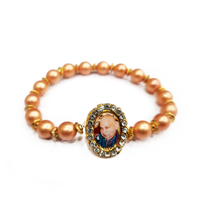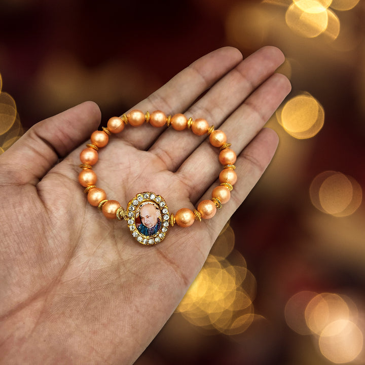 • Item Name: Orange Round Pearl Bracelet with Jai Guruji Swaroop Handmade Bracelets for Men and Women