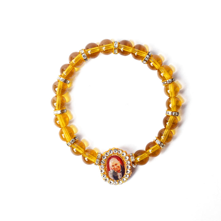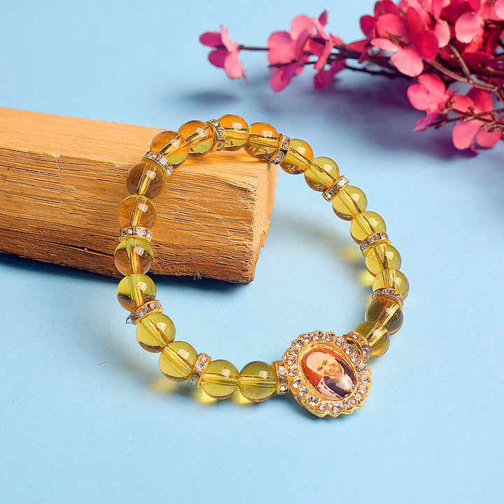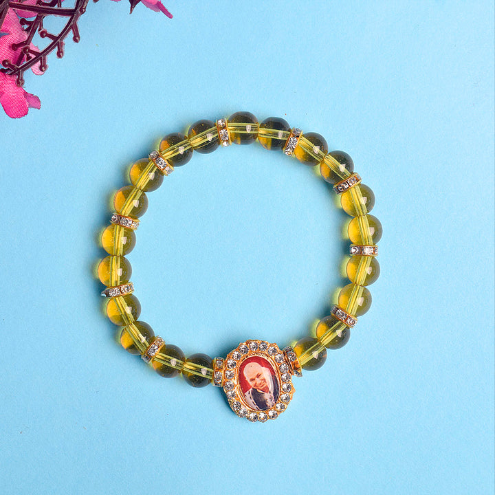 Our Guruji bracelet is a tangible symbol of divine connection. Crafted with care and reverence, it is designed to be worn close to your heart, serving as a constant reminder of Guruji's presence. The bracelet is adorned with sacred symbols and gemstones that hold spiritual significance, channeling positive energy and protection.