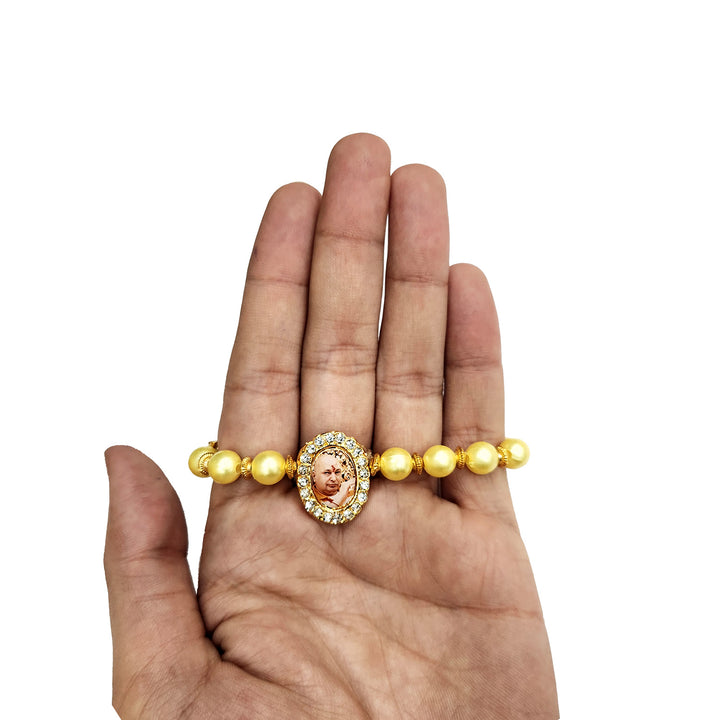 Our Guruji bracelet is a tangible symbol of divine connection. Crafted with care and reverence, it is designed to be worn close to your heart, serving as a constant reminder of Guruji's presence. The bracelet is adorned with sacred symbols and gemstones that hold spiritual significance, channeling positive energy and protection.