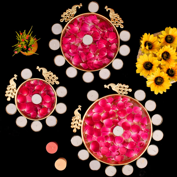Shop Metal Peacock Flower Urli with Tea Light (Pack of 3) | Satvik – satvikstore.in