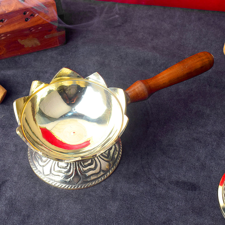 Antique Brass Loban Dingali with Wooden Handle for Pooja and Rituals