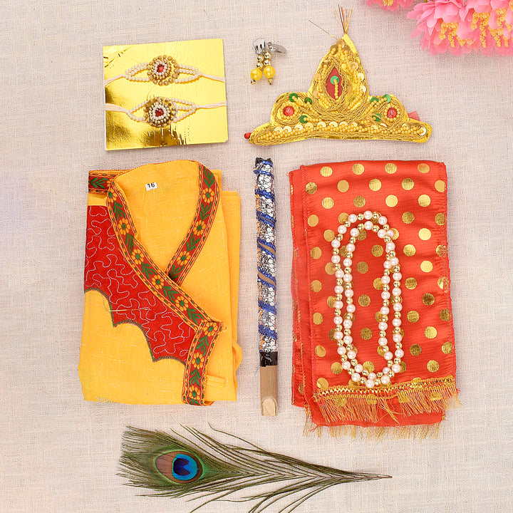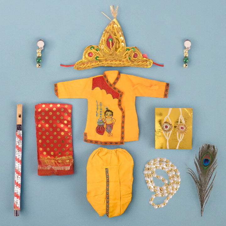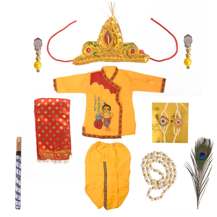 Kids Krishna outfit | yellow dhoti kurta set | jewellery shingar set | traditional kids attire | festive Krishna clothes | handcrafted pooja outfit | comfortable kids wear | vibrant Krishna dress | festival pooja accessories | kids deity clothing