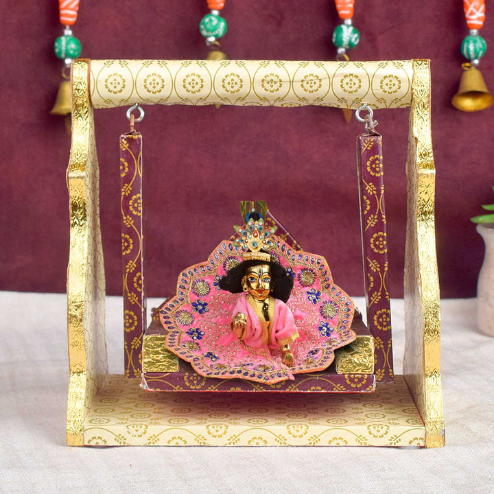 With its singhasan-style cradle, your Laddu Gopal rests royally, embraced by intricate paper design work and spiritual ambiance. Whether for daily darshan, Janmashtami, or festive décor, this handcrafted swing is a serene seat of devotion and grace.